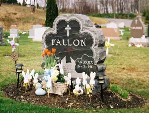 | Now it's off to St. Mary's Cemetery where we find that the Fallons were all ready for Easter. Holiday decorations on graves in St. Mary's are themselves worth a web site. I made sure some of my people had solar night lights by their markers before I left. |