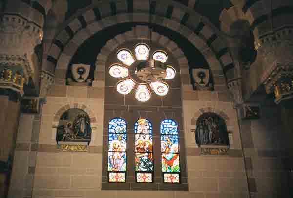 | Just off Hazle Street is St. Patrick's church, an amazingly sumptuous building for a coal-mining area. All the old churches are pretty but whoever paid for putting up St. Patrick's around 1940 contributed some serious dough. It's all cut stone with a copper roof. It was an Irish parish, but the stations have an eastern look about them. Perhaps they were done by an Eastern-rite or orthodox artist. |