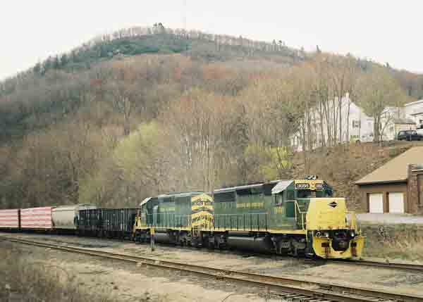 | Sunday morning in Tamaqua. My earliest memory of Tamaqua is the sight of old steam locomotives sitting in its exensive rail yards. The engines were probably awaiting the scrapper's torch. Tamaqua was a place through which the Reading Railroad hauled coal out of the First Field and down along the Little Schuylkill River. In the 1850s and 60s, the Molly Maguires inspired terror in this area and The Reading Co. used them to portray unions as a bunch of thugs. Today what's left of the old Reading right-of-way is used by the Reading, Blue Mountain & Northern, one of PA's several new railroads run by train buffs. There is still money to be made hauling lumber, cement and of course, coal. Here an RBMN lash-up idles while the engineer goes to Burger King. |